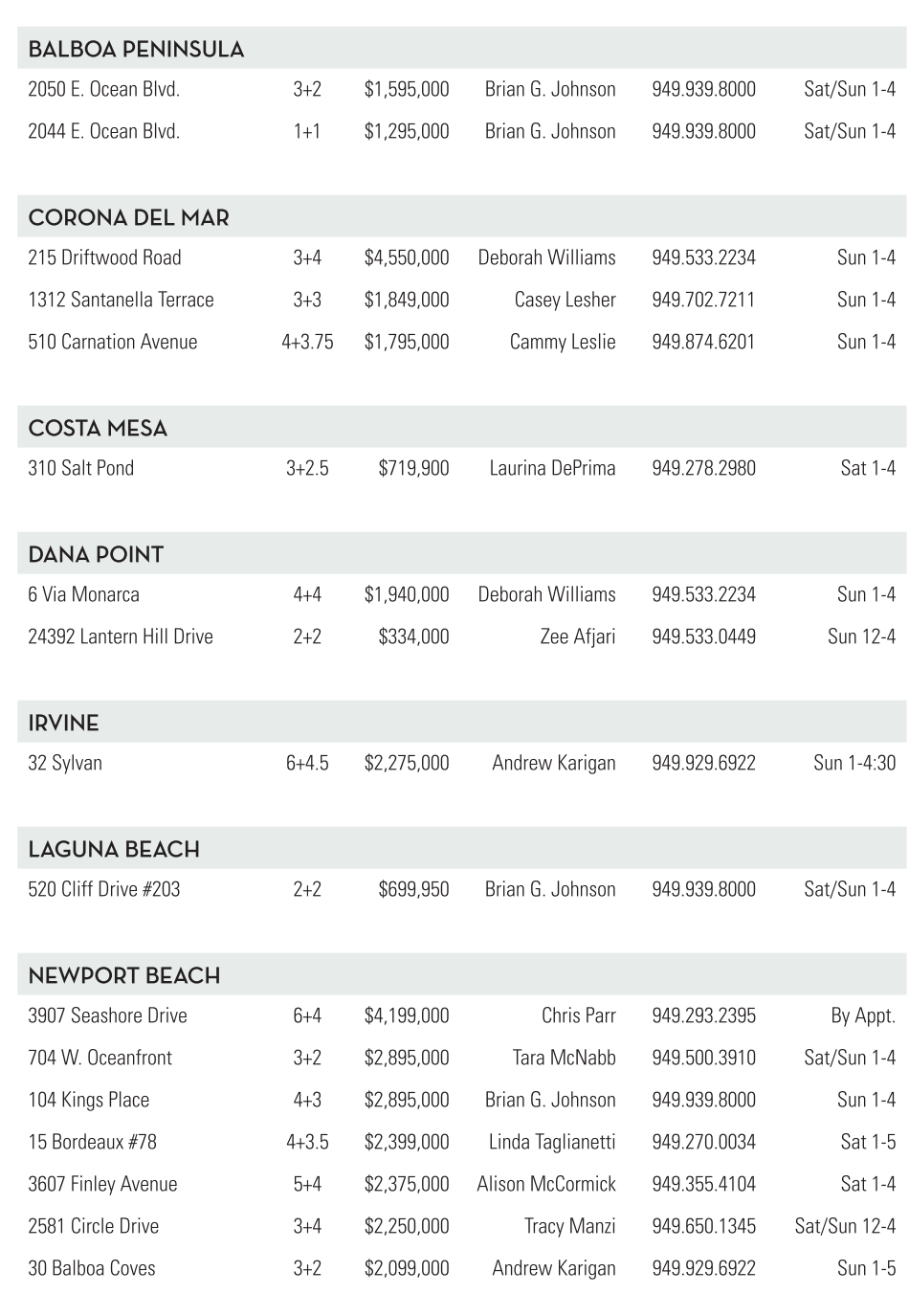 704 W. Oceanfront 3+2 $2,895,000 Tara McNabb 949.500.3910 Sat/Sun 1-4