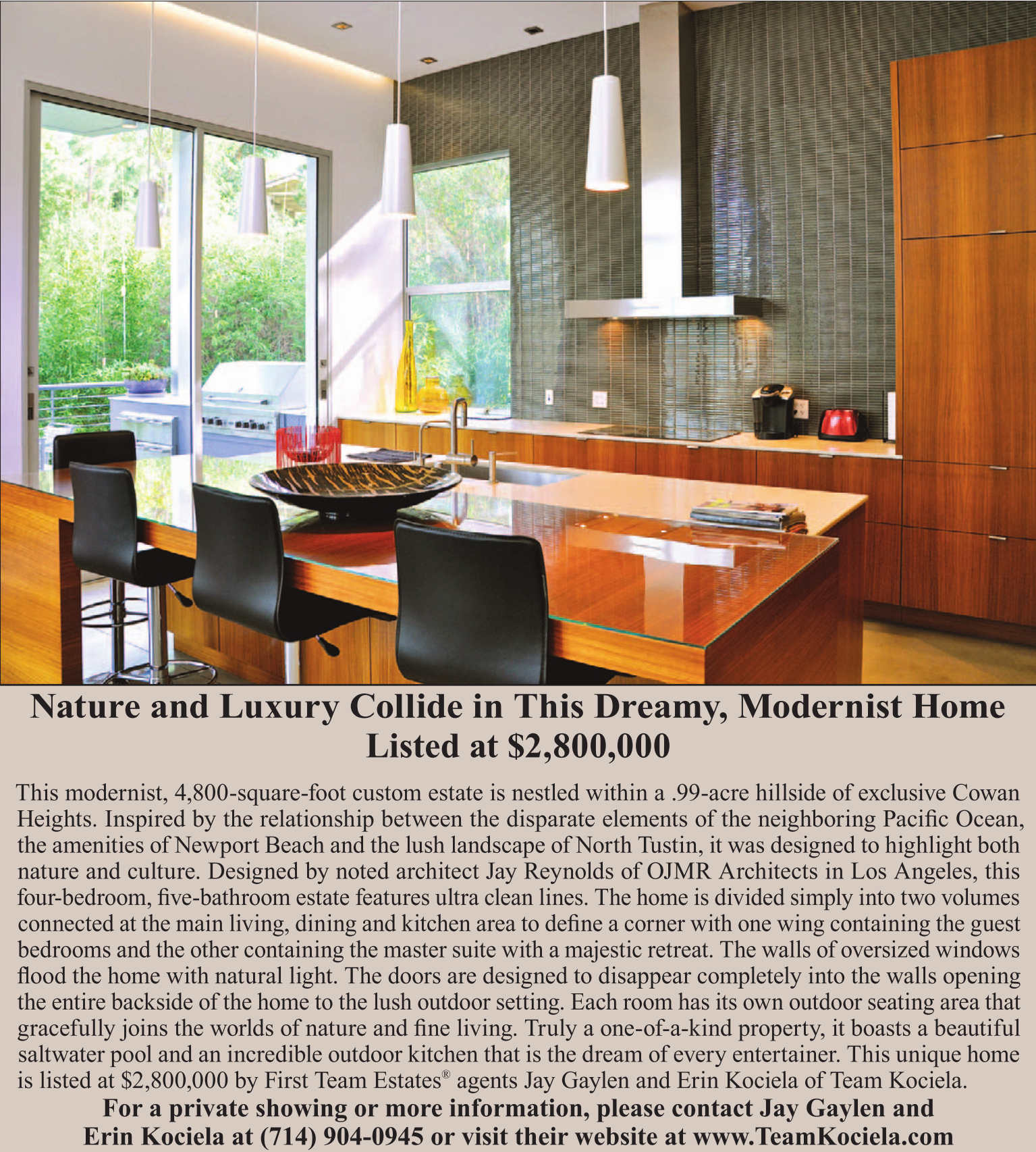 Nature and Luxury Collide in This Dreamy, Modernist Home Listed at $2,800,000 This modernist, 4,800-square-foot custom estate is nestled within a .99-acre hillside of exclusive Cowan Heights. Inspired by the relationship between the disparate elements of the neighboring Pacific Ocean, the amenities of Newport Beach and the lush landscape of North Tustin, it was designed to highlight both nature and culture. Designed by noted architect Jay Reynolds of OJMR Architects in Los Angeles, this four-bedroom, five-bathroom estate features ultra clean lines. The home is divided simply into two volumes connected at the main living, dining and kitchen area to define a corner with one wing containing the guest bedrooms and the other containing the master suite with a majestic retreat. The walls of oversized windows flood the home with natural light. The doors are designed to disappear completely into the walls opening the entire backside of the home to the lush outdoor setting. Each room has its own outdoor seating area that gracefully joins the worlds of nature and fine living. Truly a one-of-a-kind property, it boasts a beautiful saltwater pool and an incredible outdoor kitchen that is the dream of every entertainer. This unique home is listed at $2,800,000 by First Team Estates ® agents Jay Gaylen and Erin Kociela of Team Kociela. For a private showing or more information, please contact Jay Gaylen and Erin Kociela at (714) 904-0945 or visit their website at www.TeamKociela.com