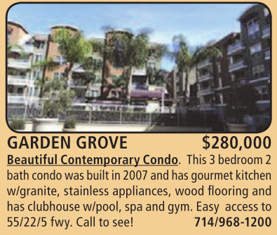 GARDEN GROVE $280,000 Beautiful Contemporary Condo. This 3 bedroom 2 bath condo was built in 2007 and has gourmet kitchen w/granite, stainless appliances, wood flooring and has clubhouse w/pool, spa and gym. Easy access to 55/22/5 fwy. Call to see! 714/968-1200