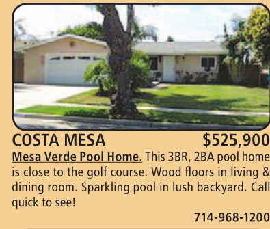 COSTA MESA $525,900 Mesa Verde Pool Home. This 3BR, 2BA pool home