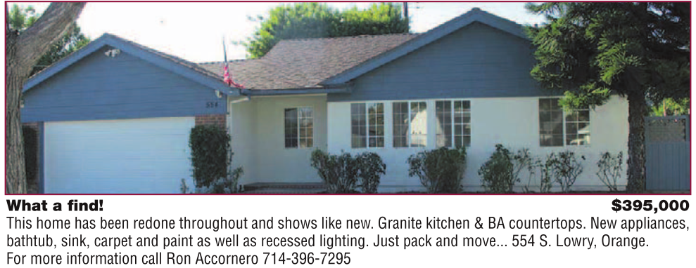 What a find! $395,000 This home has been redone throughout and shows like new. Granite kitchen & BA countertops. New appliances, bathtub, sink, carpet and paint as well as recessed lighting. Just pack and move... 554 S. Lowry, Orange. For more information call Ron Accornero 714-396-7295