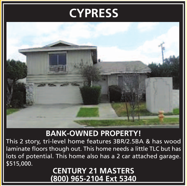 CYPRESS BANK-OWNED PROPERTY! This 2 story, tri-level home features 3BR/2.5BA & has wood laminate floors though out. This home needs a little TLC but has lots of potential. This home also has a 2 car attached garage. $515,000. CENTURY 21 MASTERS (800) 965-2104 Ext 5340