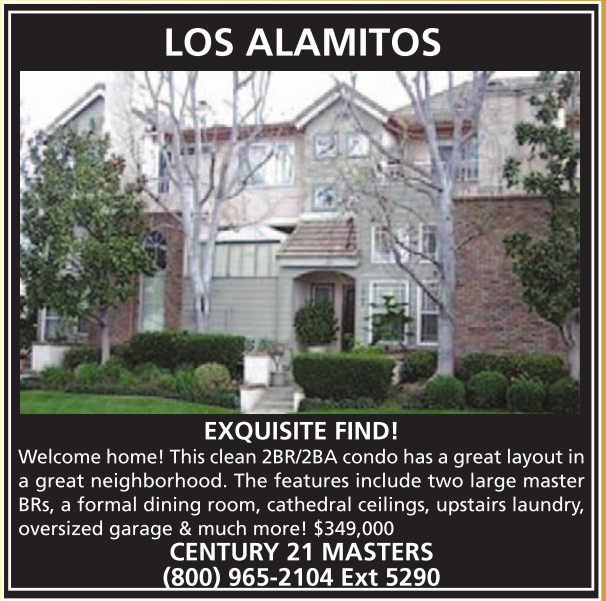 LOS ALAMITOS EXQUISITE FIND! Welcome home! This clean 2BR/2BA condo has a great layout in a great neighborhood. The features include two large master BRs, a formal dining room, cathedral ceilings, upstairs laundry, oversized garage & much more! $349,000 CENTURY 21 MASTERS (800) 965-2104 Ext 5290