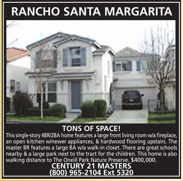 RANCHO SANTA MARGARITA TONS OF SPACE! This single-story 4BR/2BA home features a large front living room w/a fireplace, an open kitchen w/newer appliances, & hardwood flooring upstairs. The master BR features a large BA w/a walk-in closet. There are great schools nearby & a large park next to the tract for the children. This home is also walking distance to The Oneill Park Nature Preserve. $400,000. CENTURY 21 MASTERS (800) 965-2104 Ext 5320