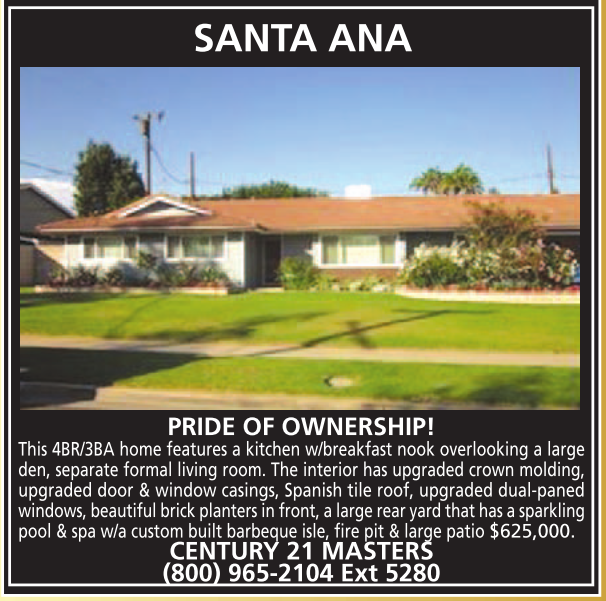 SANTA ANA PRIDE OF OWNERSHIP! This 4BR/3BA home features a kitchen w/breakfast nook overlooking a large den, separate formal living room. The interior has upgraded crown molding, upgraded door & window casings, Spanish tile roof, upgraded dual-paned windows, beautiful brick planters in front, a large rear yard that has a sparkling pool & spa w/a custom built barbeque isle, fire pit & large patio $625,000. CENTURY 21 MASTERS (800) 965-2104 Ext 5280