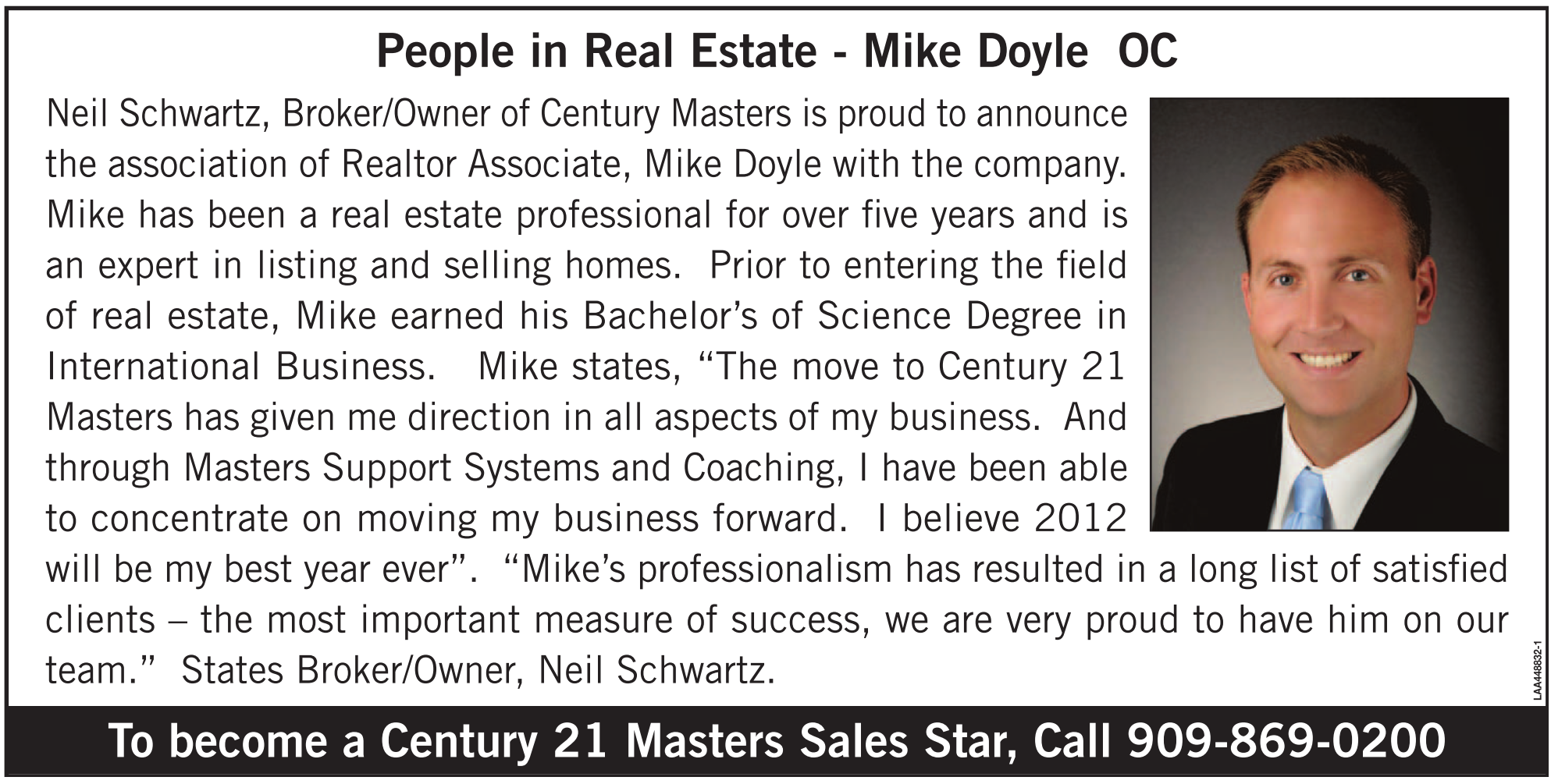 People in Real Estate - Mike Doyle OC Neil Schwartz, Broker/Owner of Century Masters is proud to announce the association of Realtor Associate, Mike Doyle with the company. Mike has been a real estate professional for over five years and is an expert in listing and selling homes. Prior to entering the field of real estate, Mike earned his Bachelor’s of Science Degree in International Business. Mike states, “The move to Century 21 Masters has given me direction in all aspects of my business. And through Masters Support Systems and Coaching, I have been able to concentrate on moving my business forward. I believe 2012 will be my best year ever”. “Mike’s professionalism has resulted in a long list of satisfied clients – the most important measure of success, we are very proud to have him on our team.” States Broker/Owner, Neil Schwartz. To become a Century 21 Masters Sales Star, Call 909-869-0200