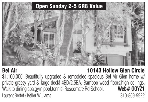 Open Sunday 2-5 GR8 Value Bel Air 10143 Hollow Glen Circle $1,100,000. Beautifully upgraded & remodeled spacious Bel-Air Glen home w/ private grassy yard & large deck! 4BD/2.5BA, Bamboo wood floors,high ceilings. Walk to dining,spa,gym,pool,tennis. Roscomare Rd School. Web# GOYZ1 Laurent Bertet / Keller Williams 310-869-9922