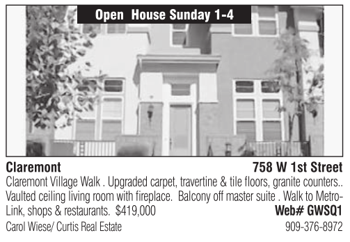 Open House Sunday 1-4 Carol Wiese/ Curtis Real Estate 909-376-8972 Claremont 758 W 1st Street Claremont Village Walk . Upgraded carpet, travertine & tile floors, granite counters.. Vaulted ceiling living room with fireplace. Balcony off master suite . Walk to Metro- Link, shops & restaurants. $419,000 Web# GWSQ1