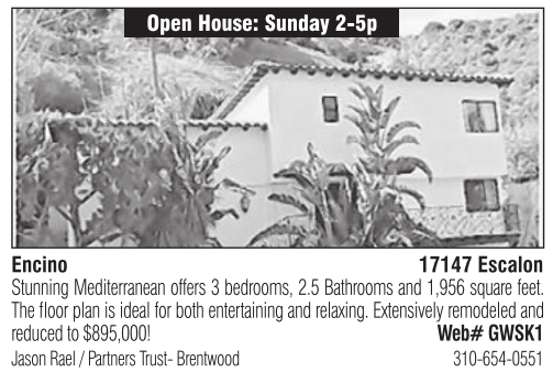 Open House: Sunday 2-5p Encino 17147 Escalon Stunning Mediterranean offers 3 bedrooms, 2.5 Bathrooms and 1,956 square feet. The floor plan is ideal for both entertaining and relaxing. Extensively remodeled and reduced to $895,000! Web# GWSK1 Jason Rael / Partners Trust- Brentwood 310-654-0551