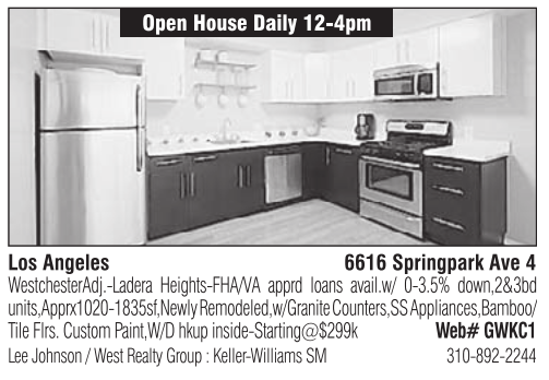 Los Angeles 6616 Springpark Ave 4 WestchesterAdj.-Ladera Heights-FHA/VA apprd loans avail.w/ 0-3.5% down,2&3bd units,Apprx1020-1835sf,NewlyRemodeled,w/GraniteCounters,SSAppliances,Bamboo/ Tile Flrs. Custom Paint,W/D hkup inside-Starting@$299k Web# GWKC1 Open House Daily 12-4pm Lee Johnson / West Realty Group : Keller-Williams SM 310-892-2244