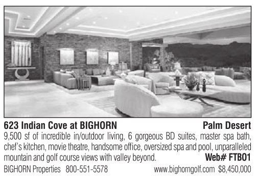 623 Indian Cove at BIGHORN Palm Desert 9,500 sf of incredible in/outdoor living, 6 gorgeous BD suites, master spa bath, chef’s kitchen, movie theatre, handsome office, oversized spa and pool, unparalleled mountain and golf course views with valley beyond. Web# FTBO1 BIGHORN Properties 800-551-5578 www.bighorngolf.com $8,450,000