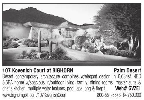 107 Kovenish Court at BIGHORN Palm Desert Desert contemporary architecture combines w/elegant design in 6,634sf, 4BD 5.5BA home w/spacious in/outdoor living, family, dining rooms, master suite & chef’s kitchen, multiple water features, pool, spa, bbq & firepit. Web# GVZE1 www.bighorngolf.com/107KovenishCourt 800-551-5578 $4,750,000