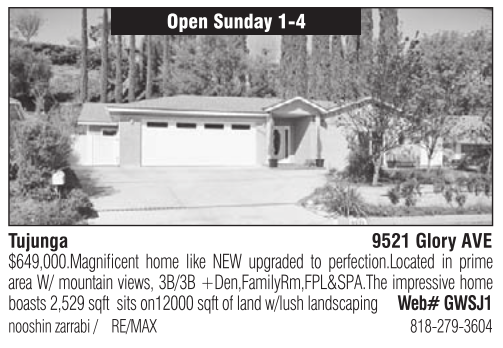 Open Sunday 1-4 nooshin zarrabi / RE/MAX 818-279-3604 Tujunga 9521 Glory AVE $649,000.Magnificent home like NEW upgraded to perfection.Located in prime area W/ mountain views, 3B/3B +Den,FamilyRm,FPL&SPA.The impressive home boasts 2,529 sqft sits on12000 sqft of land w/lush landscaping Web# GWSJ1