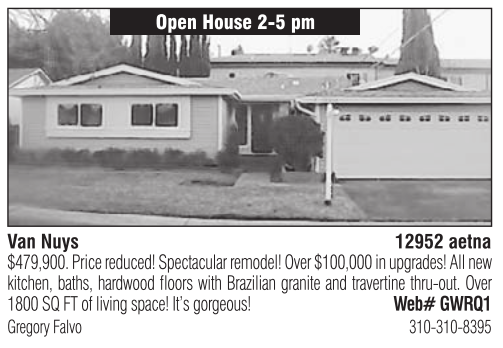 Open House 2-5 pm Van Nuys 12952 aetna $479,900. Price reduced! Spectacular remodel! Over $100,000 in upgrades! All new kitchen, baths, hardwood floors with Brazilian granite and travertine thru-out. Over 1800 SQ FT of living space! It’s gorgeous! Web# GWRQ1 Gregory Falvo 310-310-8395