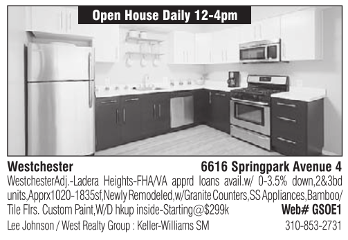 Open House Daily 12-4pm Westchester 6616 Springpark Avenue 4 WestchesterAdj.-Ladera Heights-FHA/VA apprd loans avail.w/ 0-3.5% down,2&3bd units,Apprx1020-1835sf,NewlyRemodeled,w/GraniteCounters,SSAppliances,Bamboo/ Tile Flrs. Custom Paint,W/D hkup inside-Starting@$299k Web# GSOE1 Lee Johnson / West Realty Group : Keller-Williams SM 310-853-2731