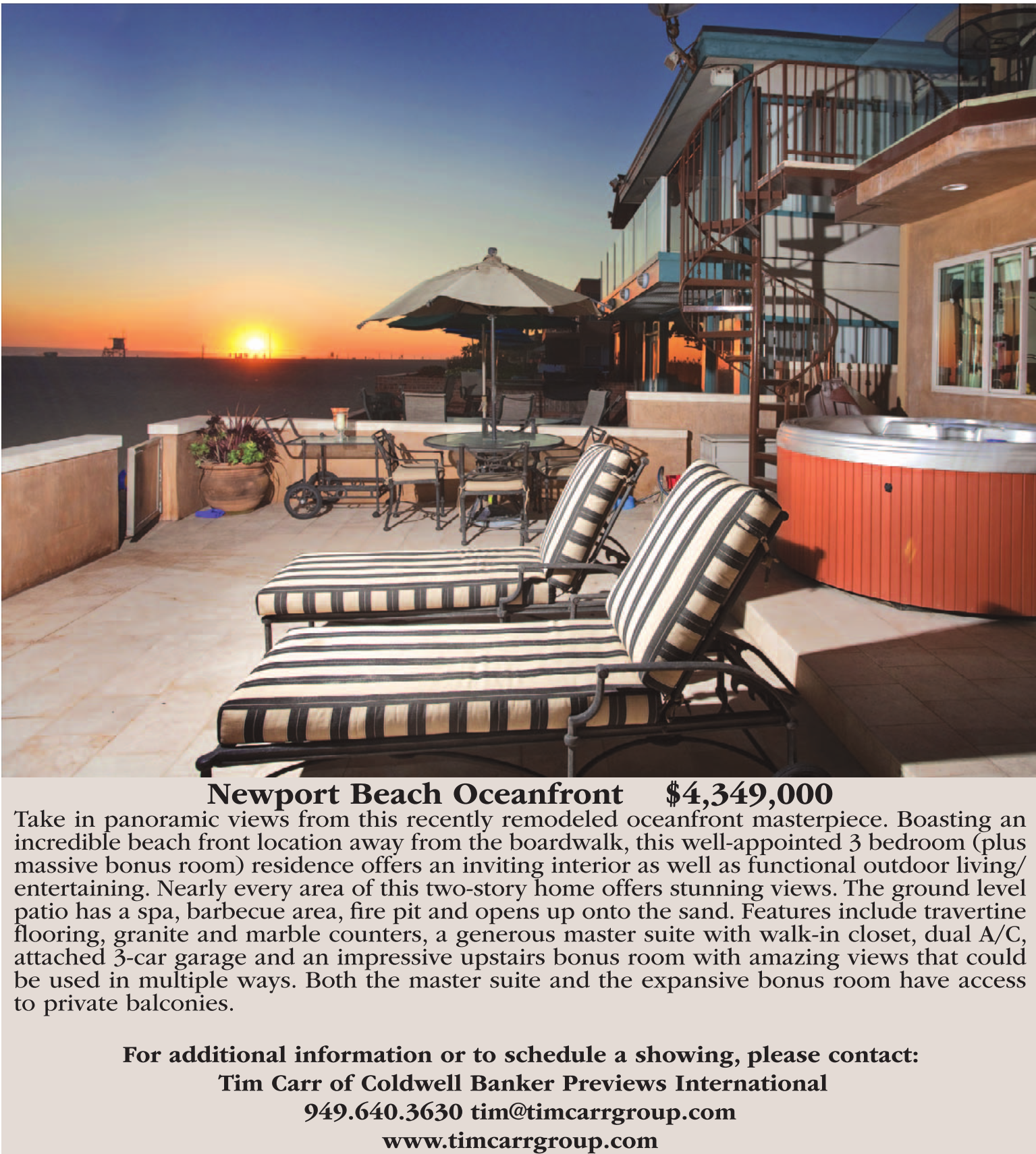 Newport Beach Oceanfront $4,349,000 Take in panoramic views from this recently remodeled oceanfront masterpiece. Boasting an incredible beach front location away from the boardwalk, this well-appointed 3 bedroom (plus massive bonus room) residence offers an inviting interior as well as functional outdoor living/ entertaining. Nearly every area of this two-story home offers stunning views. The ground level patio has a spa, barbecue area, fire pit and opens up onto the sand. Features include travertine flooring, granite and marble counters, a generous master suite with walk-in closet, dual A/C, attached 3-car garage and an impressive upstairs bonus room with amazing views that could be used in multiple ways. Both the master suite and the expansive bonus room have access to private balconies. For additional information or to schedule a showing, please contact: Tim Carr of Coldwell Banker Previews International 949.640.3630 tim@timcarrgroup.com www.timcarrgroup.com