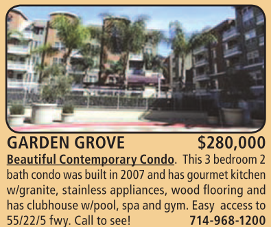 GARDEN GROVE $280,000 Beautiful Contemporary Condo. This 3 bedroom 2 bath condo was built in 2007 and has gourmet kitchen w/granite, stainless appliances, wood fl ooring and has clubhouse w/pool, spa and gym. Easy access to 55/22/5 fwy. Call to see! 714-968-1200