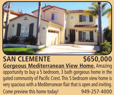 SAN CLEMENTE $650,000 Gorgeous Mediterranean View Home. Amazing opportunity to buy a 5 bedroom, 3 bath gorgeous home in the gated community of Pacific Crest. This 5 bedroom view home is very spacious with a Mediterranean flair that is open and inviting. Come preview this home today! 949-257-4000