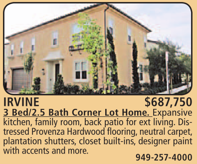IRVINE $687,750 3 Bed/2.5 Bath Corner Lot Home. Expansive kitchen, family room, back patio for ext living. Distressed Provenza Hardwood flooring, neutral carpet, plantation shutters, closet built-ins, designer paint with accents and more. 949-257-4000