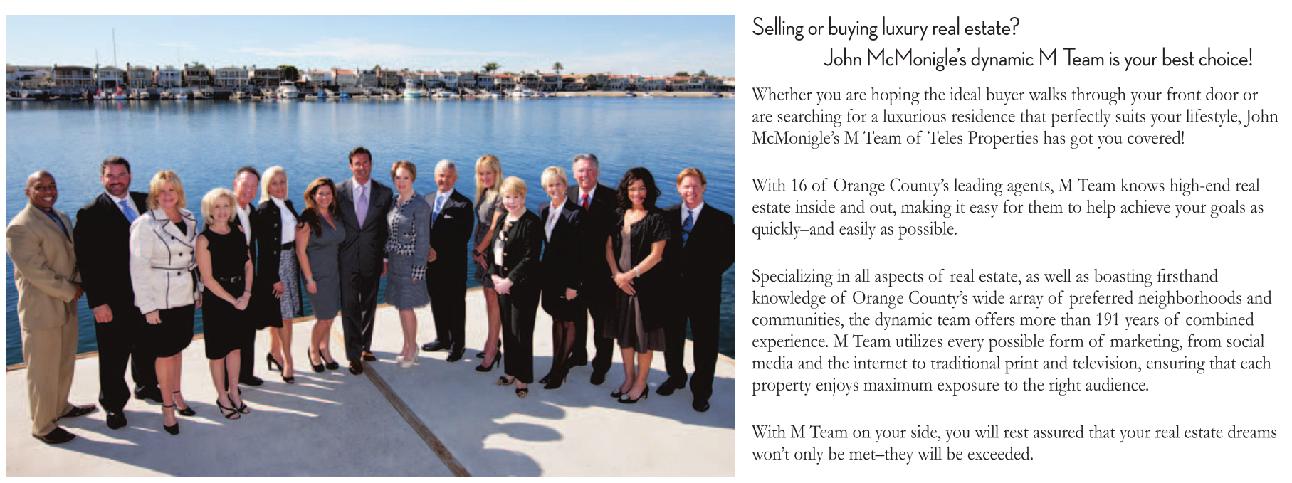 Specializing in all aspects of real estate, as well as boasting firsthand knowledge of Orange County’s wide array of preferred neighborhoods and communities, the dynamic team offers more than 191 years of combined experience. M Team utilizes every possible form of marketing, from social media and the internet to traditional print and television, ensuring that each property enjoys maximum exposure to the right audience.
