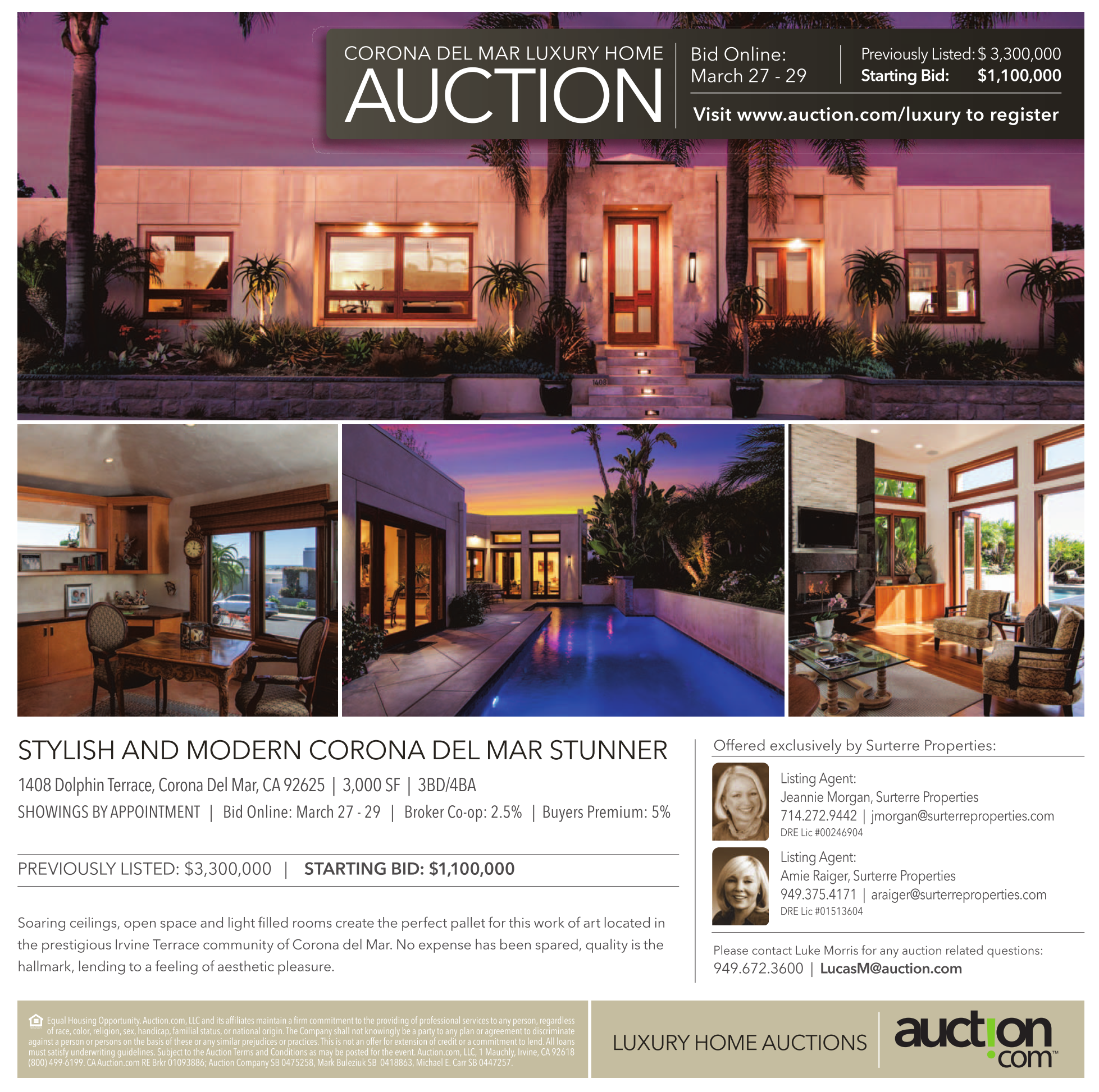 1408 Dolphin Terrace, Corona Del Mar, CA 92625 | 3,000 SF | 3BD/4BA SHOWINGS BY APPOINTMENT | Bid Online: March 27 - 29 | Broker Co-op: 2.5% | Buyers Premium: 5%