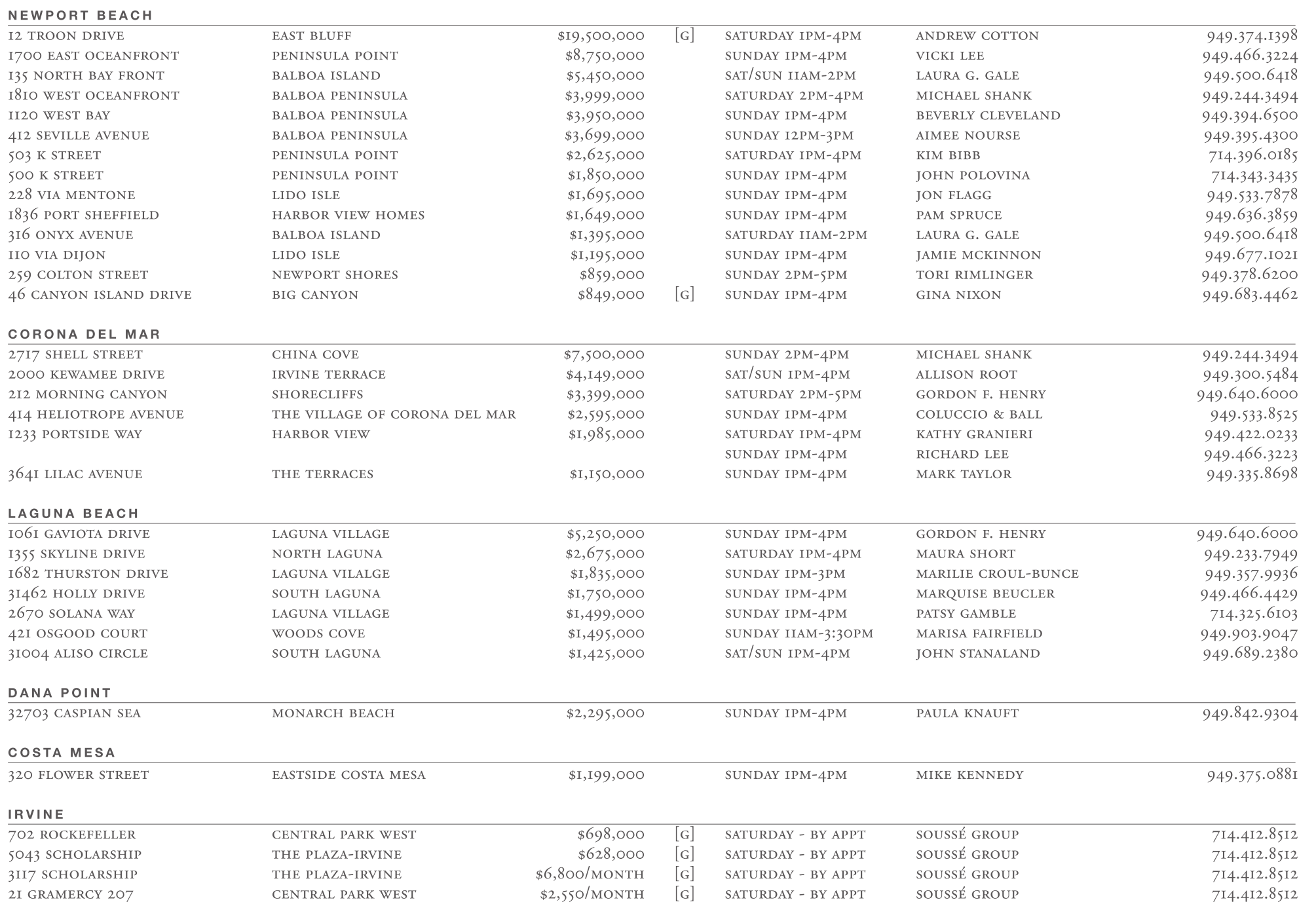 NEWPORT BEACH 12 troon drive east bluff $19,500,000 [g] saturday 1pm-4pm andrew cotton 949.374.1398 1700 east oceanfront peninsula point $8,750,000 sunday 1pm-4pm vicki lee 949.466.3224 135 north bay front balboa island $5,450,000 sat/sun 11am-2pm laura g. gale 949.500.6418 1810 west oceanfront balboa peninsula $3,999,000 saturday 2pm-4pm michael shank 949.244.3494 1120 west bay balboa peninsula $3,950,000 sunday 1pm-4pm beverly cleveland 949.394.6500 412 seville avenue balboa peninsula $3,699,000 sunday 12pm-3pm aimee nourse 949.395.4300 503 k street peninsula point $2,625,000 saturday 1pm-4pm kim bibb 714.396.0185 500 k street peninsula point $1,850,000 sunday 1pm-4pm john polovina 714.343.3435 228 via mentone lido isle $1,695,000 sunday 1pm-4pm jon flagg 949.533.7878 1836 port sheffield harbor view homes $1,649,000 sunday 1pm-4pm pam spruce 949.636.3859 316 onyx avenue balboa island $1,395,000 saturday 11am-2pm laura g. gale 949.500.6418 110 via dijon lido isle $1,195,000 sunday 1pm-4pm jamie mckinnon 949.677.1021 259 colton street newport shores $859,000 sunday 2pm-5pm tori rimlinger 949.378.6200 46 canyon island drive big canyon $849,000 [g] sunday 1pm-4pm gina nixon 949.683.4462