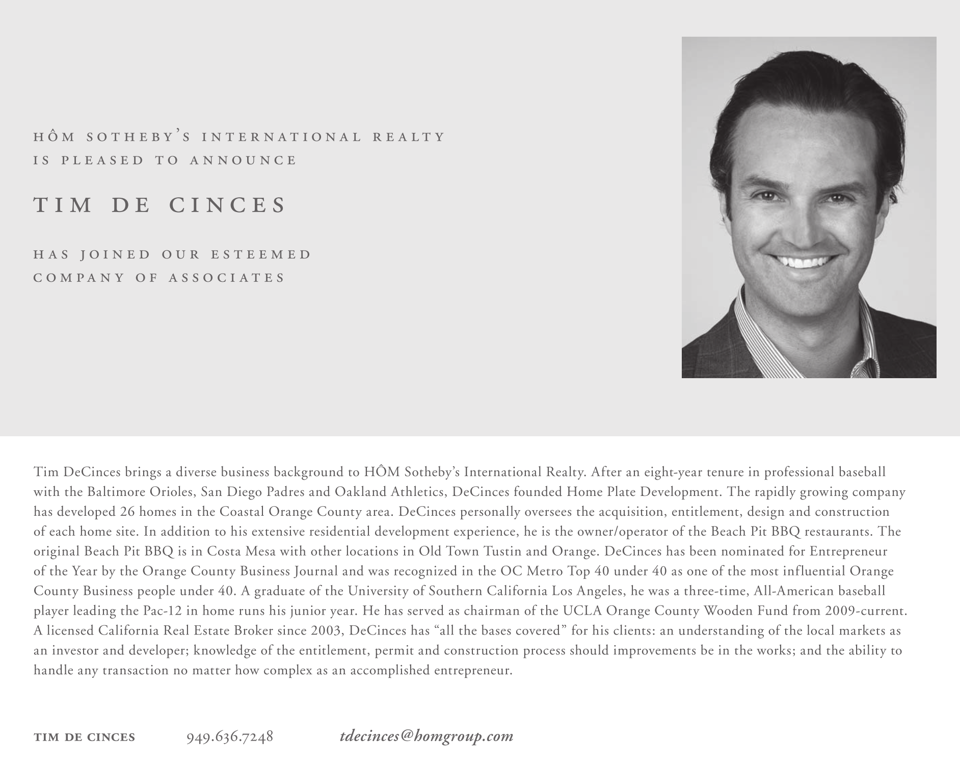 h ô m s o t h e b y ’s i n t e r n a t i o n a l r e a l t y i s p l e a s e d t o a n n o u n c e t i m d e c i n c e s h a s j o i n e d o u r e s t e e m e d c o m pa n y o f a s s o c i a t e s Tim DeCinces brings a diverse business background to HÔM Sotheby’s International Realty. After an eight-year tenure in professional baseball with the Baltimore Orioles, San Diego Padres and Oakland Athletics, DeCinces founded Home Plate Development. The rapidly growing company has developed 26 homes in the Coastal Orange County area. DeCinces personally oversees the acquisition, entitlement, design and construction of each home site. In addition to his extensive residential development experience, he is the owner/operator of the Beach Pit BBQ restaurants. The original Beach Pit BBQ is in Costa Mesa with other locations in Old Town Tustin and Orange. DeCinces has been nominated for Entrepreneur of the Year by the Orange County Business Journal and was recognized in the OC Metro Top 40 under 40 as one of the most influential Orange County Business people under 40. A graduate of the University of Southern California Los Angeles, he was a three-time, All-American baseball player leading the Pac-12 in home runs his junior year. He has served as chairman of the UCLA Orange County Wooden Fund from 2009-current. A licensed California Real Estate Broker since 2003, DeCinces has “all the bases covered” for his clients: an understanding of the local markets as an investor and developer; knowledge of the entitlement, permit and construction process should improvements be in the works; and the ability to handle any transaction no matter how complex as an accomplished entrepreneur. tim de cinces 949.636.7248 tdecinces@homgroup.com