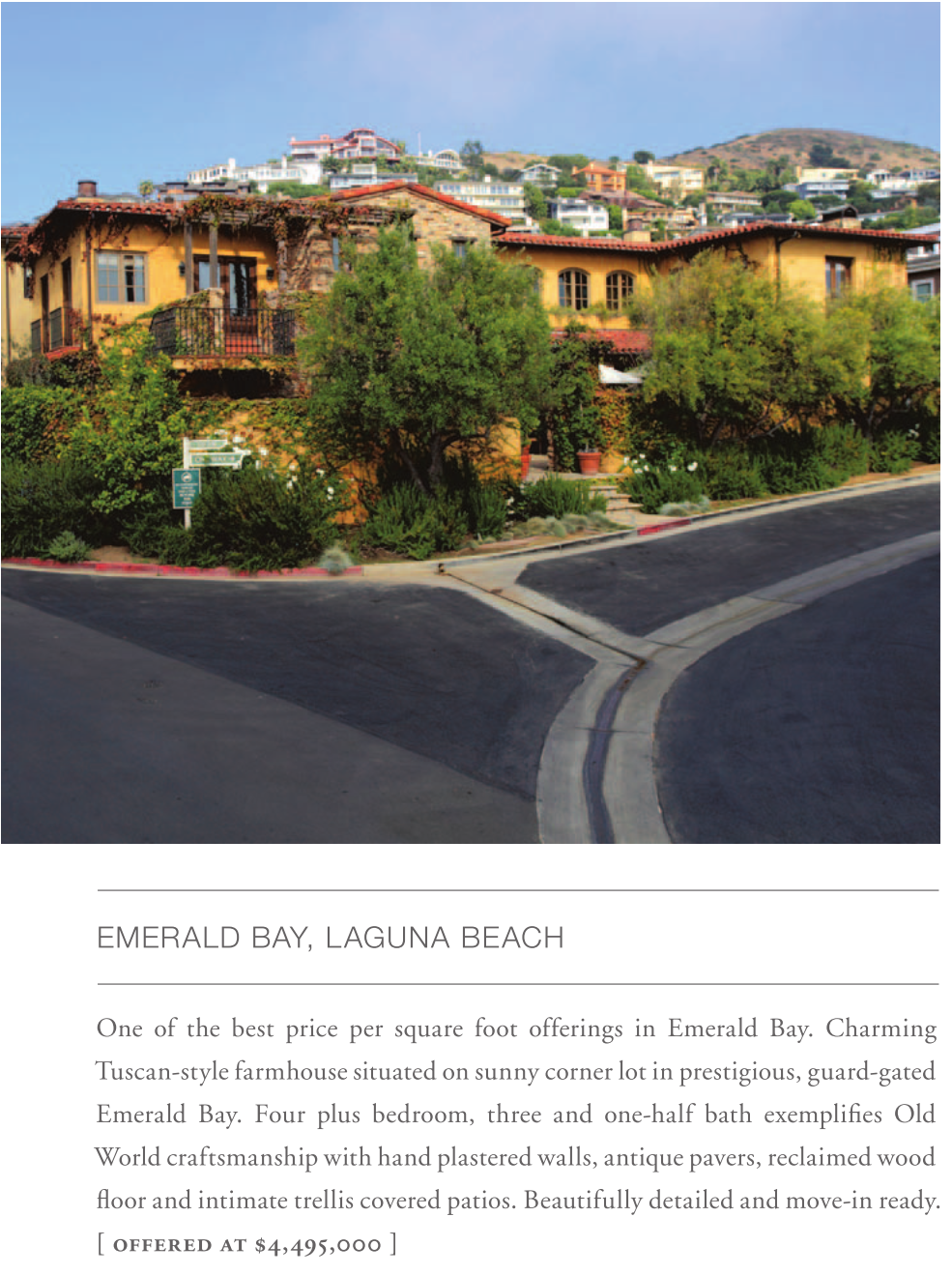 EMERALD BAY, LAGUNA BEACH One of the best price per square foot offerings in Emerald Bay. Charming Tuscan-style farmhouse situated on sunny corner lot in prestigious, guard-gated Emerald Bay. Four plus bedroom, three and one-half bath exemplifies Old World craftsmanship with hand plastered walls, antique pavers, reclaimed wood floor and intimate trellis covered patios. Beautifully detailed and move-in ready. [ offered at $4,495,000 ]