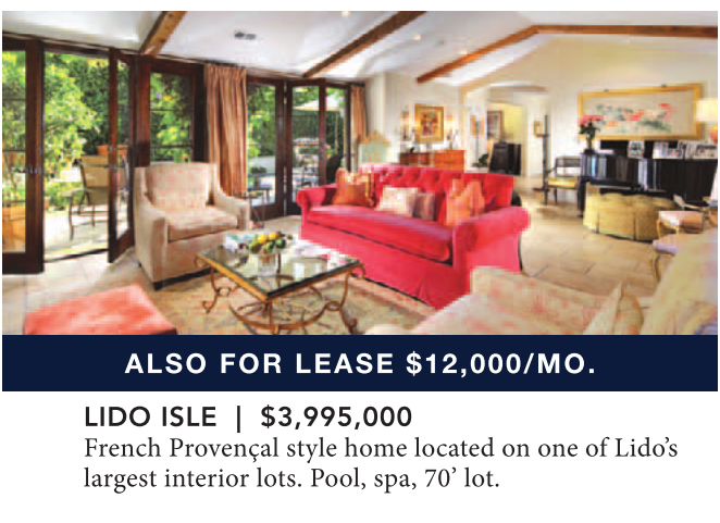 LIDO ISLE | $3,995,000 French Provençal style home located on one of Lido’s largest interior lots. Pool, spa, 70’ lot.