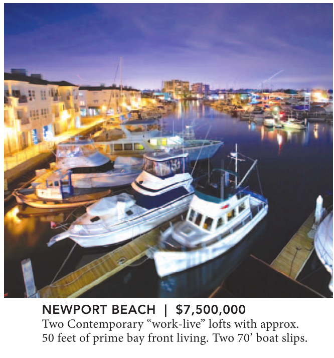 NEWPORT BEACH | $7,500,000 Two Contemporary “work-live” lofts with approx. 50 feet of prime bay front living. Two 70’ boat slips.