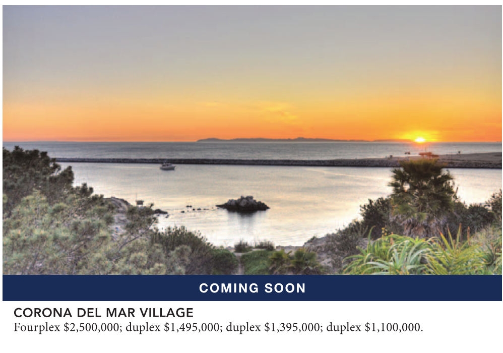 CORONA DEL MAR VILLAGE Fourplex $2,500,000; duplex $1,495,000; duplex $1,395,000; duplex $1,100,000.