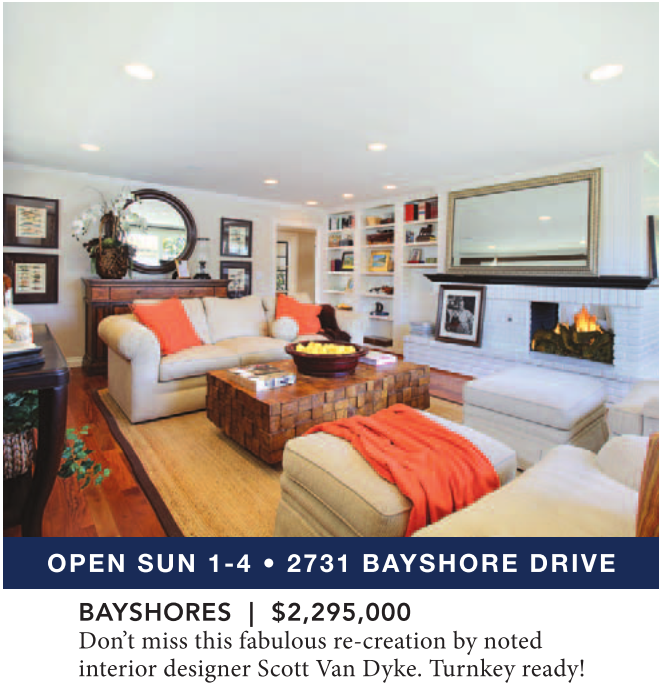 BAYSHORES | $2,295,000 Don’t miss this fabulous re-creation by noted interior designer Scott Van Dyke. Turnkey ready!