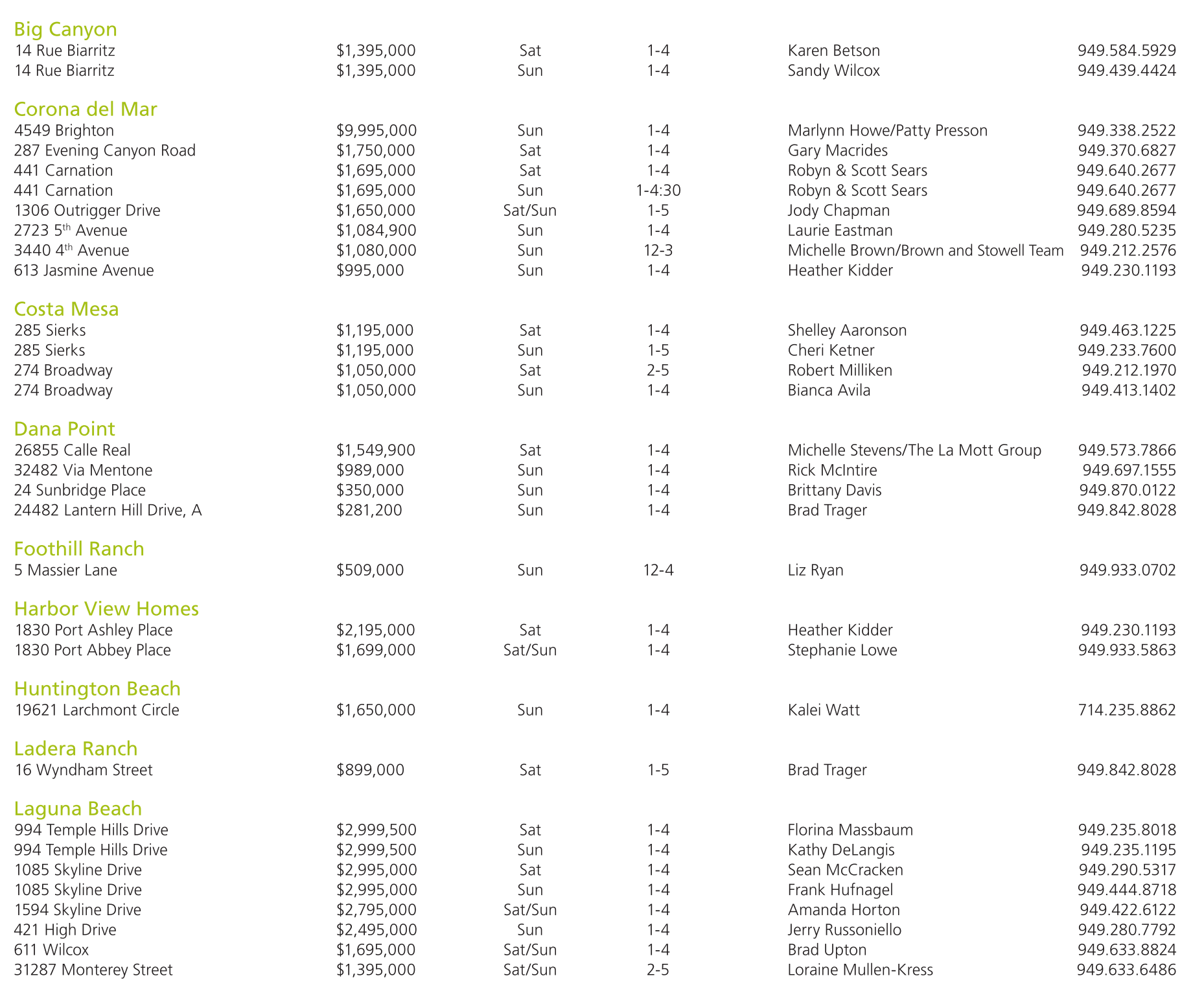 Big Canyon 14 Rue Biarritz $1,395,000 Sat 1-4 Karen Betson 949.584.5929 14 Rue Biarritz $1,395,000 Sun 1-4 Sandy Wilcox 949.439.4424 Corona del Mar 4549 Brighton $9,995,000 Sun 1-4 Marlynn Howe/Patty Presson 949.338.2522 287 Evening Canyon Road $1,750,000 Sat 1-4 Gary Macrides 949.370.6827 441 Carnation $1,695,000 Sat 1-4 Robyn & Scott Sears 949.640.2677 441 Carnation $1,695,000 Sun 1-4:30 Robyn & Scott Sears 949.640.2677 1306 Outrigger Drive $1,650,000 Sat/Sun 1-5 Jody Chapman 949.689.8594 2723 5 th Avenue $1,084,900 Sun 1-4 Laurie Eastman 949.280.5235 3440 4 th Avenue $1,080,000 Sun 12-3 Michelle Brown/Brown and Stowell Team 949.212.2576 613 Jasmine Avenue $995,000 Sun 1-4 Heather Kidder 949.230.1193 Costa Mesa 285 Sierks $1,195,000 Sat 1-4 Shelley Aaronson 949.463.1225 285 Sierks $1,195,000 Sun 1-5 Cheri Ketner 949.233.7600 274 Broadway $1,050,000 Sat 2-5 Robert Milliken 949.212.1970 274 Broadway $1,050,000 Sun 1-4 Bianca Avila 949.413.1402 Dana Point 26855 Calle Real $1,549,900 Sat 1-4 Michelle Stevens/The La Mott Group 949.573.7866 32482 Via Mentone $989,000 Sun 1-4 Rick McIntire 949.697.1555 24 Sunbridge Place $350,000 Sun 1-4 Brittany Davis 949.870.0122 24482 Lantern Hill Drive, A $281,200 Sun 1-4 Brad Trager 949.842.8028 Foothill Ranch 5 Massier Lane $509,000 Sun 12-4 Liz Ryan 949.933.0702 Harbor View Homes 1830 Port Ashley Place $2,195,000 Sat 1-4 Heather Kidder 949.230.1193 1830 Port Abbey Place $1,699,000 Sat/Sun 1-4 Stephanie Lowe 949.933.5863 Huntington Beach 19621 Larchmont Circle $1,650,000 Sun 1-4 Kalei Watt 714.235.8862 Ladera Ranch 16 Wyndham Street $899,000 Sat 1-5 Brad Trager 949.842.8028 Laguna Beach 994 Temple Hills Drive $2,999,500 Sat 1-4 Florina Massbaum 949.235.8018 994 Temple Hills Drive $2,999,500 Sun 1-4 Kathy DeLangis 949.235.1195 1085 Skyline Drive $2,995,000 Sat 1-4 Sean McCracken 949.290.5317 1085 Skyline Drive $2,995,000 Sun 1-4 Frank Hufnagel 949.444.8718 1594 Skyline Drive $2,795,000 Sat/Sun 1-4 Amanda Horton 949.422.6122 421 High Drive $2,495,000 Sun 1-4 Jerry Russoniello 949.280.7792 611 Wilcox $1,695,000 Sat/Sun 1-4 Brad Upton 949.633.8824 31287 Monterey Street $1,395,000 Sat/Sun 2-5 Loraine Mullen-Kress 949.633.6486