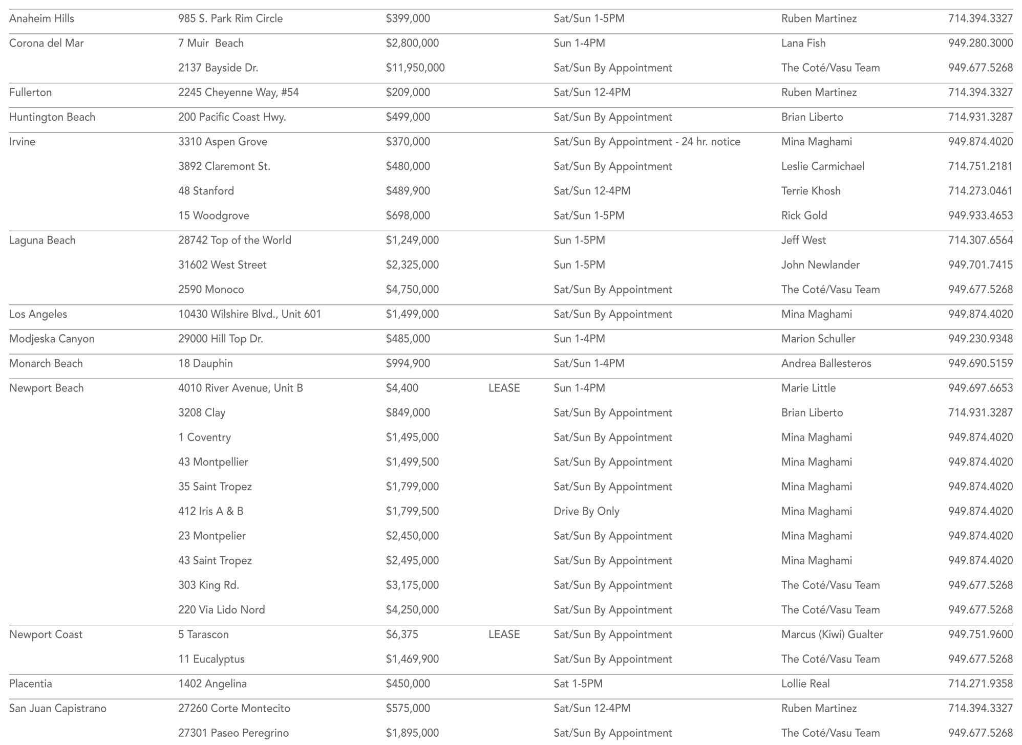 3892 Claremont St. $480,000 Sat/Sun By Appointment Leslie Carmichael 714.751.2181 48 Stanford $489,900 Sat/Sun 12-4PM Terrie Khosh 714.273.0461 15 Woodgrove $698,000 Sat/Sun 1-5PM Rick Gold 949.933.4653 Laguna Beach 28742 Top of the World $1,249,000 Sun 1-5PM Jeff West 714.307.6564 31602 West Street $2,325,000 Sun 1-5PM John Newlander 949.701.7415 2590 Monoco $4,750,000 Sat/Sun By Appointment The Coté/Vasu Team 949.677.5268 Los Angeles 10430 Wilshire Blvd., Unit 601 $1,499,000 Sat/Sun By Appointment Mina Maghami 949.874.4020 Modjeska Canyon 29000 Hill Top Dr. $485,000 Sun 1-4PM Marion Schuller 949.230.9348 Monarch Beach 18 Dauphin $994,900 Sat/Sun 1-4PM Andrea Ballesteros 949.690.5159 Newport Beach 4010 River Avenue, Unit B $4,400 LEASE Sun 1-4PM Marie Little 949.697.6653 3208 Clay $849,000 Sat/Sun By Appointment Brian Liberto 714.931.3287 1 Coventry $1,495,000 Sat/Sun By Appointment Mina Maghami 949.874.4020 43 Montpellier $1,499,500 Sat/Sun By Appointment Mina Maghami 949.874.4020 35 Saint Tropez $1,799,000 Sat/Sun By Appointment Mina Maghami 949.874.4020 412 Iris A & B $1,799,500 Drive By Only Mina Maghami 949.874.4020 23 Montpelier $2,450,000 Sat/Sun By Appointment Mina Maghami 949.874.4020 43 Saint Tropez $2,495,000 Sat/Sun By Appointment Mina Maghami 949.874.4020 303 King Rd. $3,175,000 Sat/Sun By Appointment The Coté/Vasu Team 949.677.5268 220 Via Lido Nord $4,250,000 Sat/Sun By Appointment The Coté/Vasu Team 949.677.5268 Newport Coast 5 Tarascon $6,375 LEASE Sat/Sun By Appointment Marcus (Kiwi) Gualter 949.751.9600 11 Eucalyptus $1,469,900 Sat/Sun By Appointment The Coté/Vasu Team 949.677.5268 Placentia 1402 Angelina $450,000 Sat 1-5PM Lollie Real 714.271.9358 San Juan Capistrano 27260 Corte Montecito $575,000 Sat/Sun 12-4PM Ruben Martinez 714.394.3327 27301 Paseo Peregrino $1,895,000 Sat/Sun By Appointment The Coté/Vasu Team 949.677.5268
