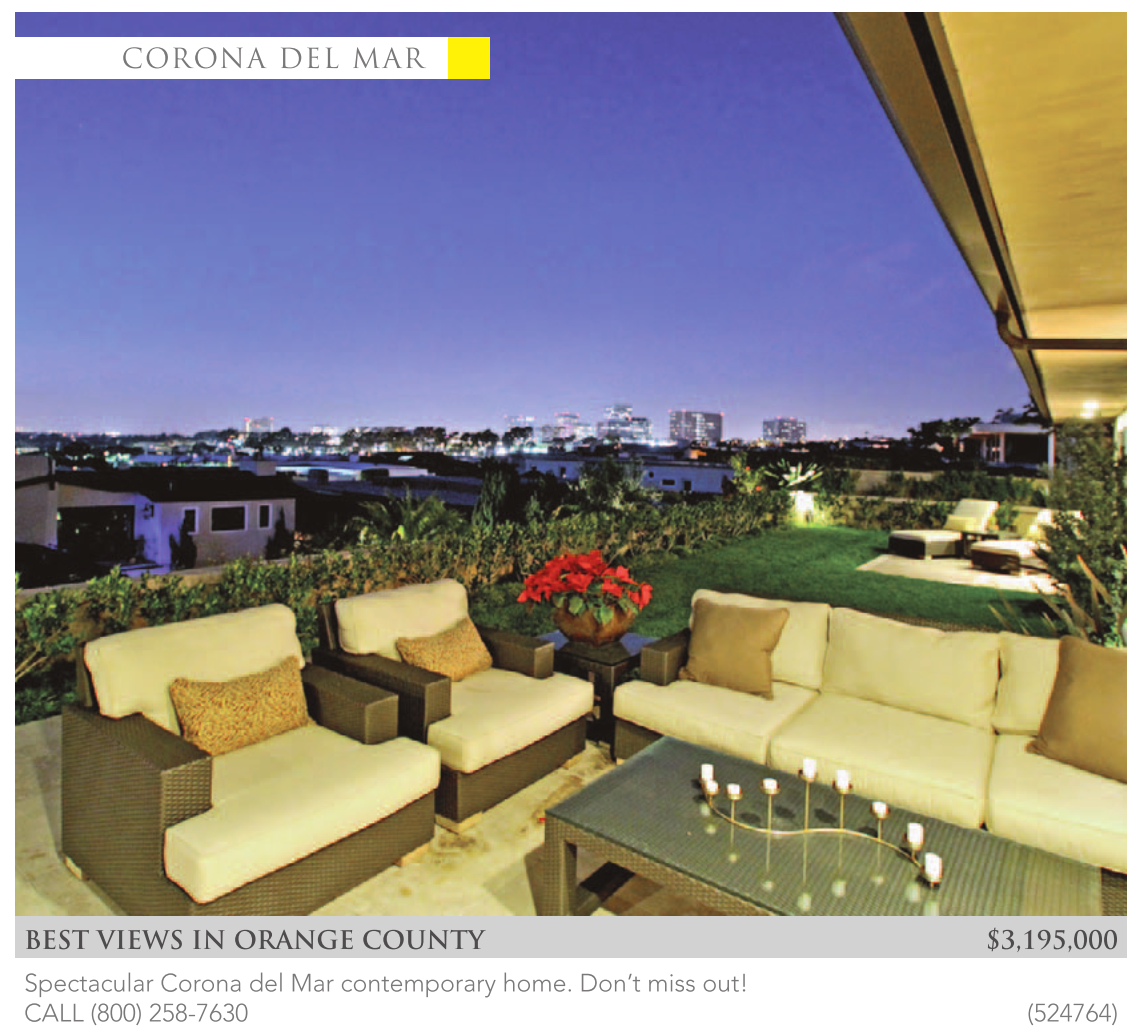 BEST VIEWS IN ORANGE COUNTY $3,195,000 Spectacular Corona del Mar contemporary home. Don’t miss out! CALL (800) 258-7630 (524764)