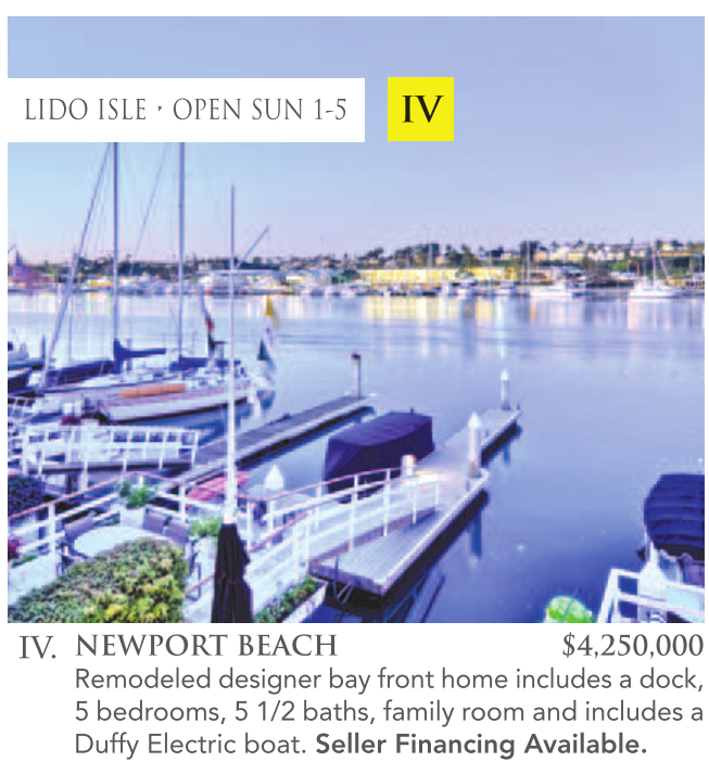 IV. NEWPORT BEACH $4,250,000 Remodeled designer bay front home includes a dock, 5 bedrooms, 5 1/2 baths, family room and includes a Duffy Electric boat. Seller Financing Available.