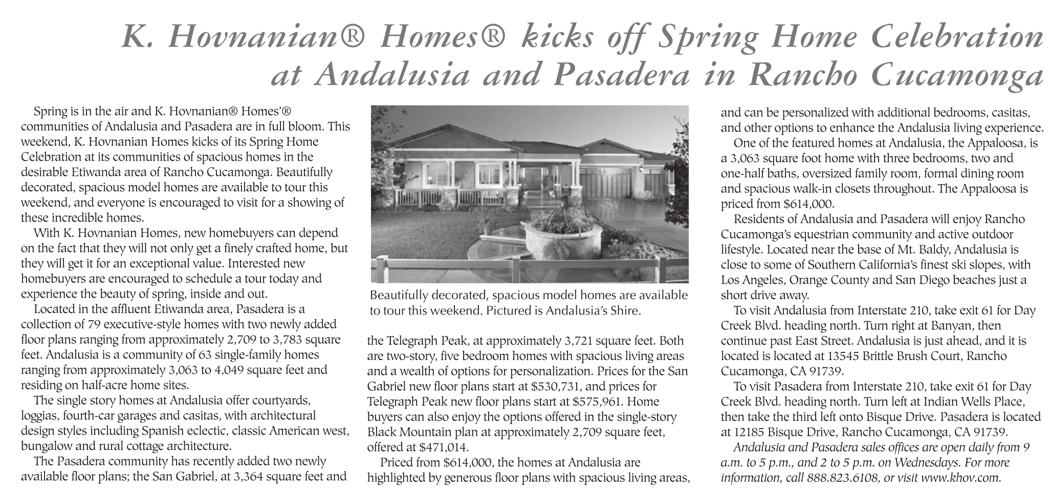 K. Hovnanian® Homes® kicks off Spring Home Celebration at Andalusia and Pasadera in Rancho Cucamonga