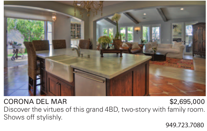 CORONA DEL MAR $2,695,000 Discover the virtues of this grand 4BD, two-story with family room. Shows off stylishly.