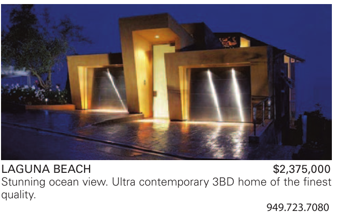 LAGUNA BEACH $2,375,000 Stunning ocean view. Ultra contemporary 3BD home of the finest quality.