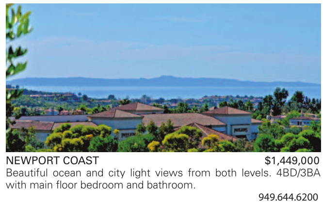 NEWPORT COAST $1,449,000 Beautiful ocean and city light views from both levels. 4BD/3BA with main floor bedroom and bathroom.