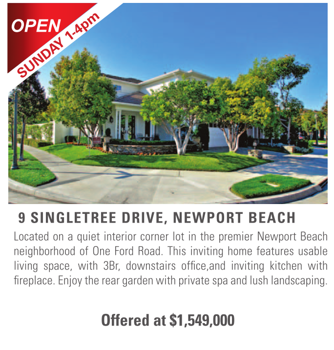 9 SINGLETREE DRIVE, NEWPORT BEACH Located on a quiet interior corner lot in the premier Newport Beach neighborhood of One Ford Road. This inviting home features usable living space, with 3Br, downstairs office,and inviting kitchen with fireplace. Enjoy the rear garden with private spa and lush landscaping.