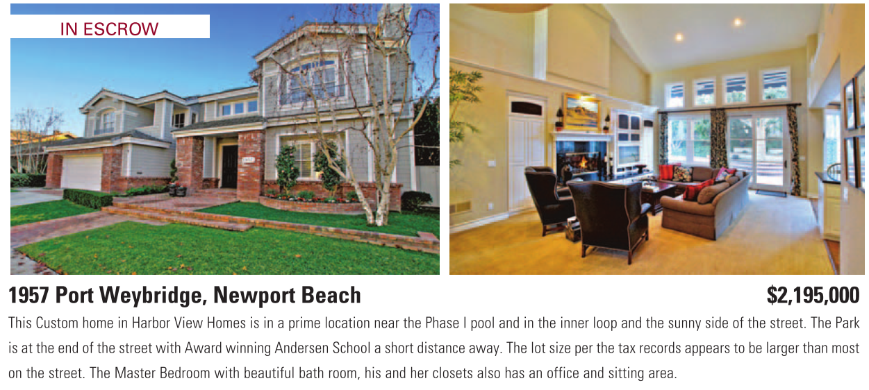 IN ESCROW 1957 Port Weybridge, Newport Beach $2,195,000 This Custom home in Harbor View Homes is in a prime location near the Phase I pool and in the inner loop and the sunny side of the street. The Park is at the end of the street with Award winning Andersen School a short distance away. The lot size per the tax records appears to be larger than most on the street. The Master Bedroom with beautiful bath room, his and her closets also has an office and sitting area. See also