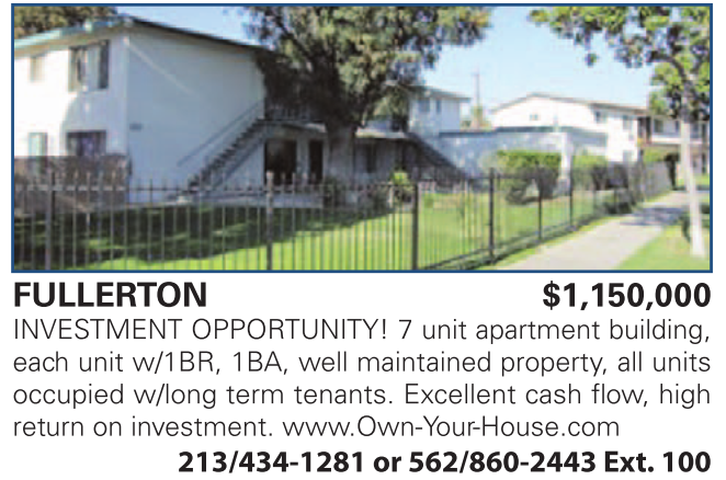 FULLERTON $1,150,000 INVESTMENT OPPORTUNITY! 7 unit apartment building, each unit w/1BR, 1BA, well maintained property, all units occupied w/long term tenants. Excellent cash flow, high return on investment. www.Own-Your-House.com 213/434-1281 or 562/860-2443 Ext. 100