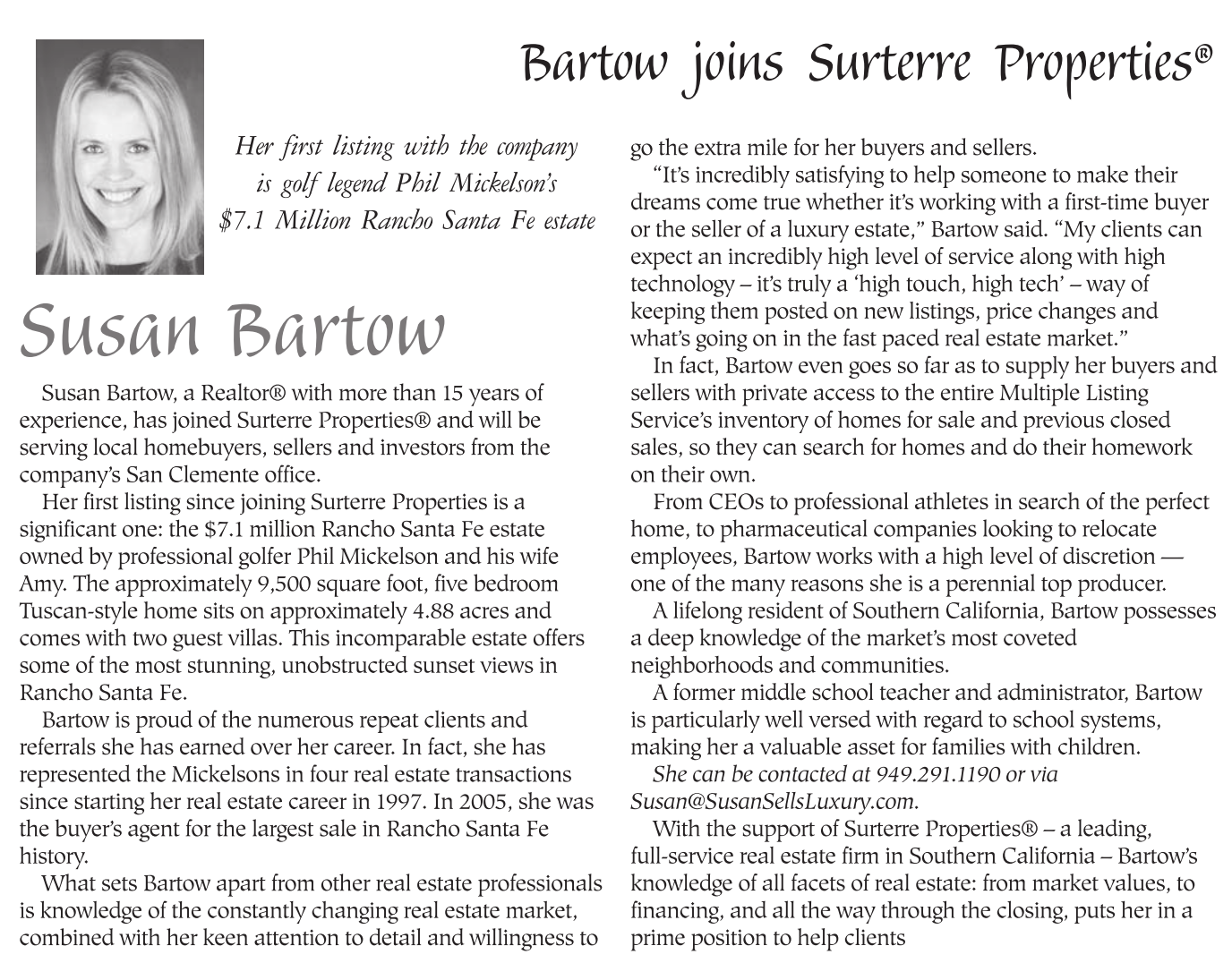 Susan Bartow, a Realtor® with more than 15 years of experience, has joined Surterre Properties® and will be serving local homebuyers, sellers and investors from the company’s San Clemente office.
