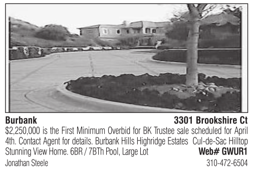 Burbank 3301 Brookshire Ct $2,250,000 is the First Minimum Overbid for BK Trustee sale scheduled for April 4th. Contact Agent for details. Burbank Hills Highridge Estates Cul-de-Sac Hilltop Stunning View Home. 6BR / 7BTh Pool, Large Lot Web# GWUR1