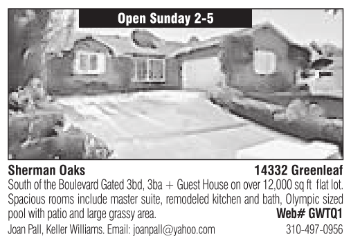 Sherman Oaks 14332 Greenleaf South of the Boulevard Gated 3bd, 3ba + Guest House on over 12,000 sq ft flat lot. Spacious rooms include master suite, remodeled kitchen and bath, Olympic sized pool with patio and large grassy area. Web# GWTQ1 Joan Pall, Keller Williams. Email: joanpall@yahoo.com 310-497-0956