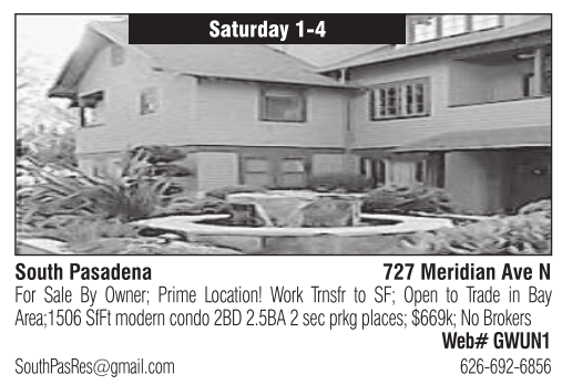 South Pasadena 727 Meridian Ave N For Sale By Owner; Prime Location! Work Trnsfr to SF; Open to Trade in Bay Area;1506 SfFt modern condo 2BD 2.5BA 2 sec prkg places; $669k; No Brokers Web# GWUN1 SouthPasRes@gmail.com 626-692-6856