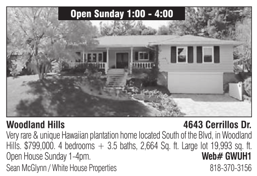 Very rare & unique Hawaiian plantation home located South of the Blvd, in Woodland Hills. $799,000. 4 bedrooms + 3.5 baths, 2,664 Sq. ft. Large lot 19,993 sq. ft. Open House Sunday 1-4pm. Web# GWUH1 Sean McGlynn / White House Properties 818-370-3156