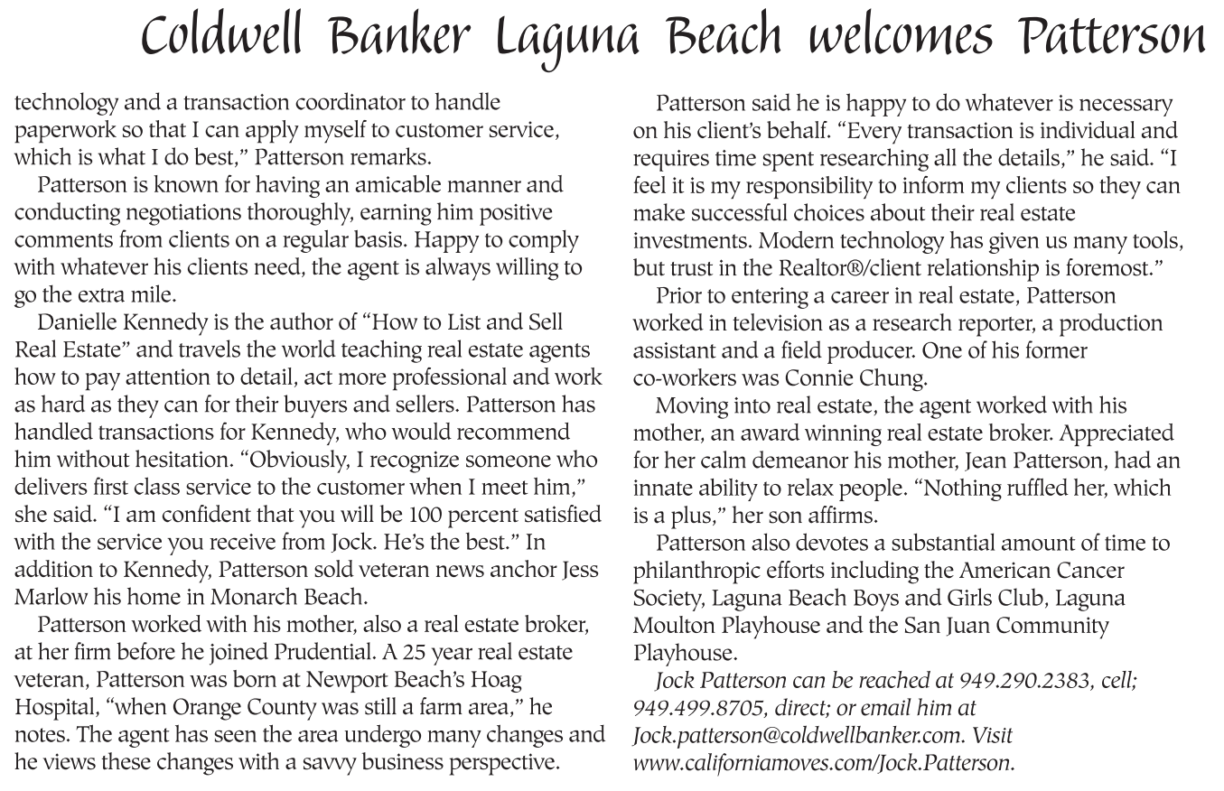 Jock Patterson can be reached at 949.290.2383, cell; 949.499.8705, direct; or email him at Jock.patterson@coldwellbanker.com. Visit www.californiamoves.com/Jock.Patterson.