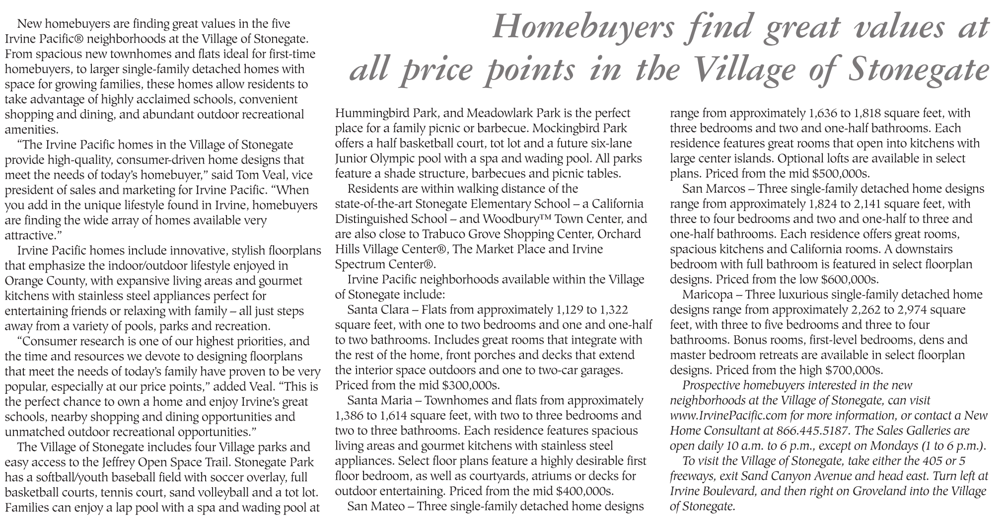 Prospective homebuyers interested in the new neighborhoods at the Village of Stonegate, can visit www.IrvinePacific.com for more information, or contact a New Home Consultant at 866.445.5187. The Sales Galleries are open daily 10 a.m. to 6 p.m., except on Mondays (1 to 6 p.m.).